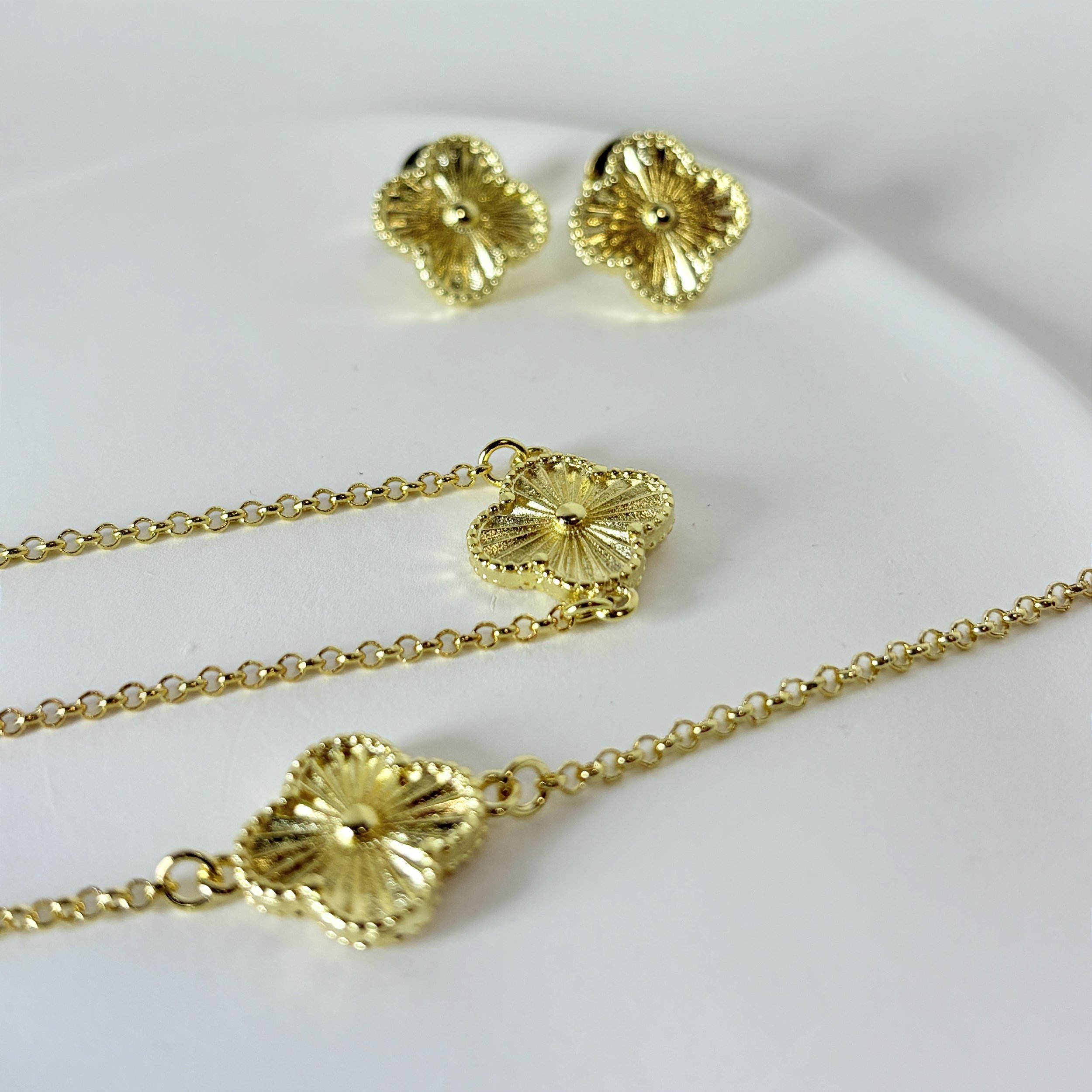 Conjunto Virginia Trevo em Relevo no banho de ouro 18k